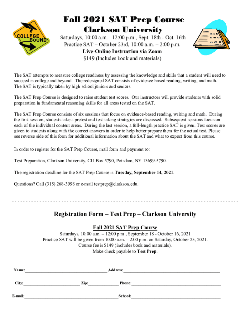 Fall 2021 SAT Prep Course Clarkson University Saturdays, 10:00 a.m. 12:00 p.m., Sept. 18th Oct. 16th Practice SAT October 23rd, 10:00 a.m. 2:00 p.m. Lifeline Instruction via Zoom $149 (Includes book