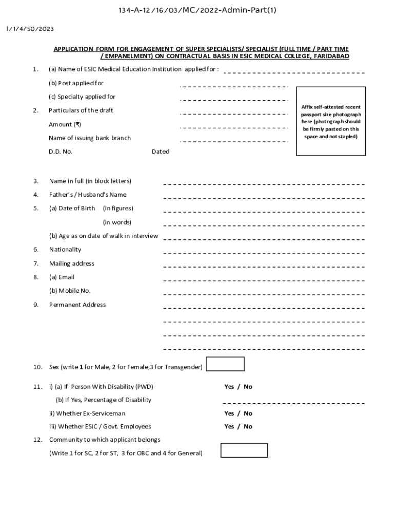 134A12/16/03/MC/2022AdminPart(1) I/174750/2023APPLICATION FORM FOR ENGAGEMENT OF SUPER SPECIALISTS/ SPECIALIST (FULL TIME / PART TIME / EMBANKMENT) ON CONTRACTUAL BASIS IN ERIC MEDICAL COLLEGE, FARIDABAD