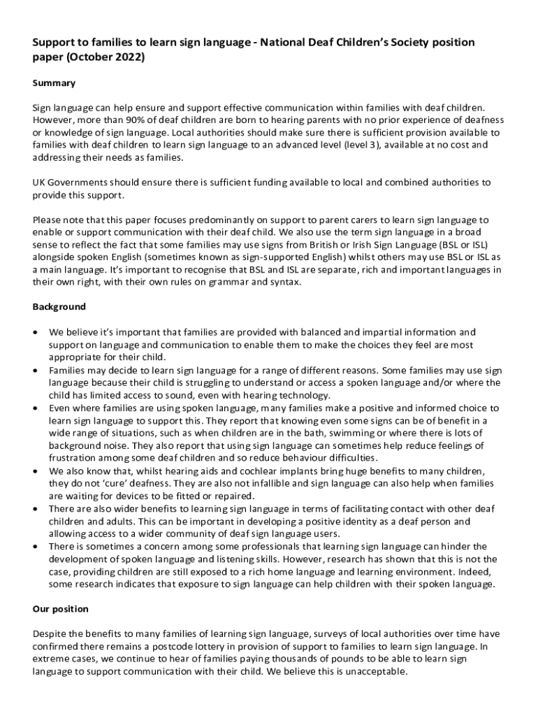 Support to families to learn sign language National Deaf Children's Society position paper (October 2022) Summary Sign language can help ensure and support effective communication within families