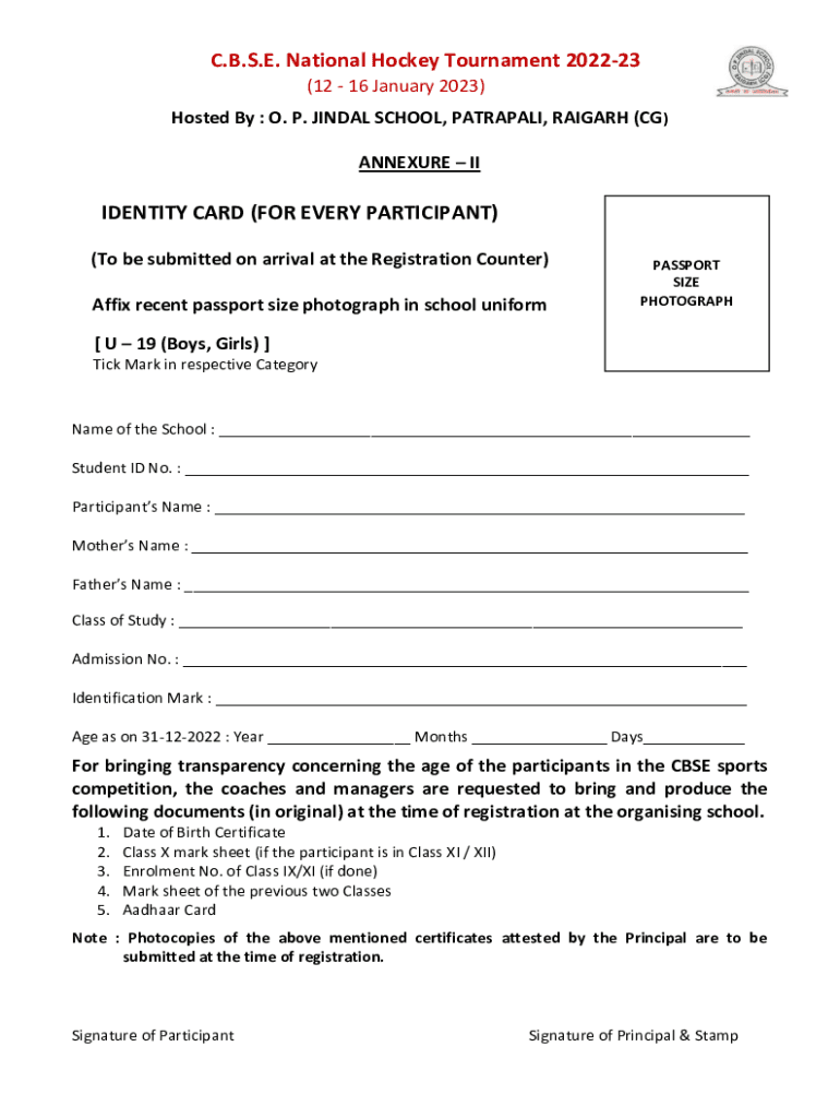 C.B.S.E. National Hockey Tournament 202223 (12 16 January 2023) Hosted By : O. P. FINAL SCHOOL, PATANJALI, ALIGARH (CG) Appendix IDENTITY CARD (FOR EVERY PARTICIPANT) (To be submitted on arrival at