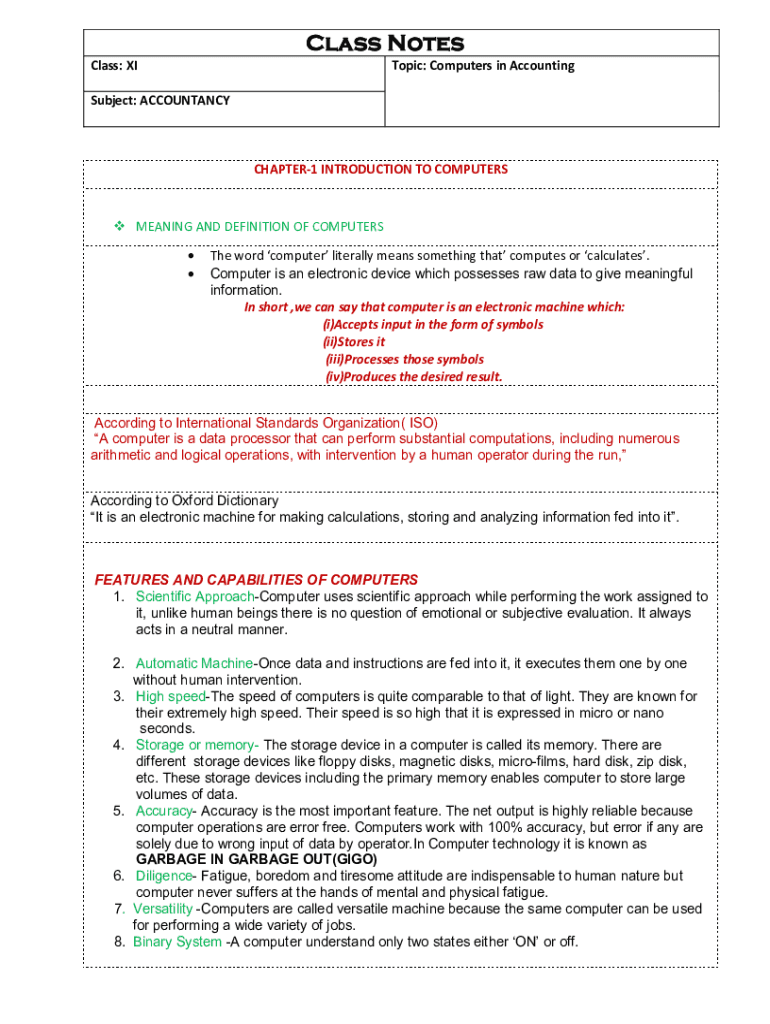 Class Notes Class: Topic: Computers in AccountingSubject: ACCOUNTANCYCHAPTER1 INTRODUCTION TO COMPUTERS MEANING AND DEFINITION OF COMPUTERS The word computer literally means something that computes