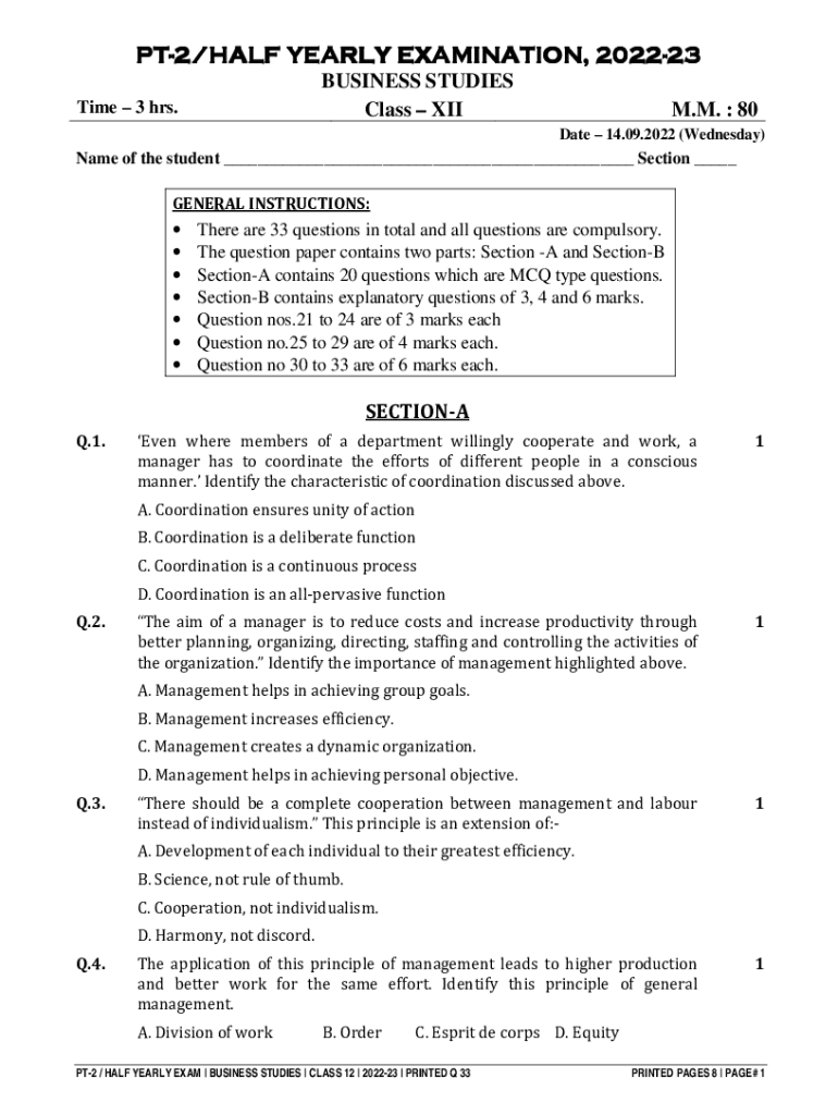 PTPT2/HALF 2/HALF YEARLY EXAMINATION, 2022 20222223 BUSINESS STUDIES Class Airtime 3 hrs. M.M. : 80 Date 14.09.2022 (Wednesday)Name of the student ___ Section ___ GENERAL INSTRUCTIONS: There are 33