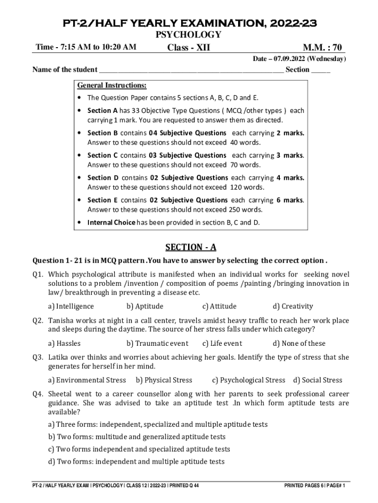 PTPT2/HALF YEARLY EXAMINATION, 2022202223 Time 7:15 AM to 10:20 PSYCHOLOGY Class IIM. M. 70 Date 07.09.2022 (Wednesday)Name of the student ___ Section ___ General Instructions: The Question Paper