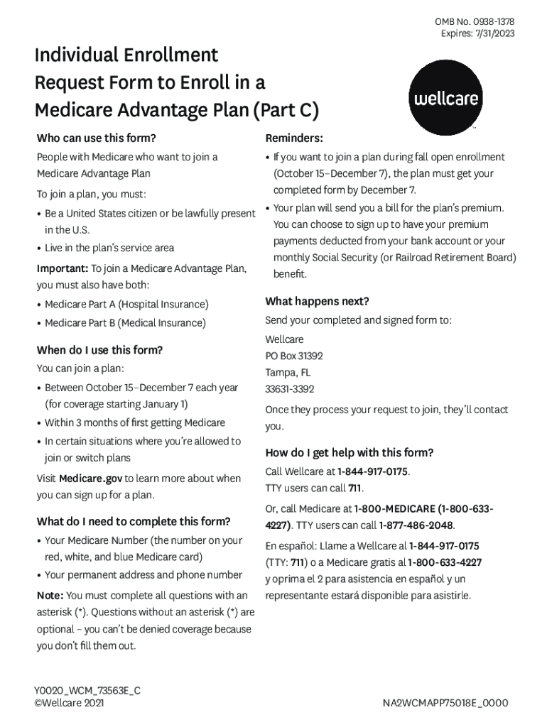 OMB No. 09381378 Expires: 7/31/2023Individual Enrollment Request Form to Enroll in a Medicare Advantage Plan (Part C) Who can use this form? Reminders:People with Medicare who want to join a Medicare
