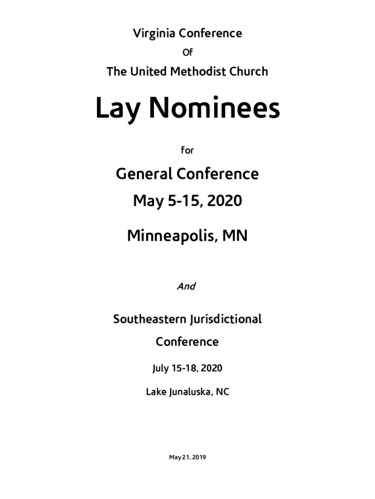 Virginia Conference Of the United Methodist Churchman Nominees general Conference May 515, 2020 Minneapolis, MN Southeastern Jurisdictional Conference July 1518, 2020 Lake Tunguska, NC May 21, 2019ATTENTION(Lay