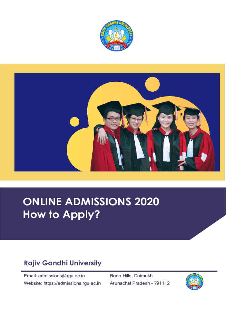 ONLINE ADMISSIONS 2020 How to Apply? Rajiv Gandhi University Email: admissions@rgu.ac.inRono Hills, DoimukhWebsite: https://admissions.rgu.ac.inArunachal Pradesh 7911122TABLE OF CONTENTS INTRODUCTION