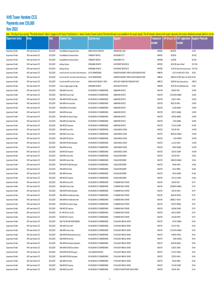 NHS Tower Hamlets CCG Payments over 30,000 Nov 2020Note : This Report has a prompt Threshold Amount which is mapped to AP Invoice Total Amount i.e. Invoice Header Amount (column Threshold Amount is