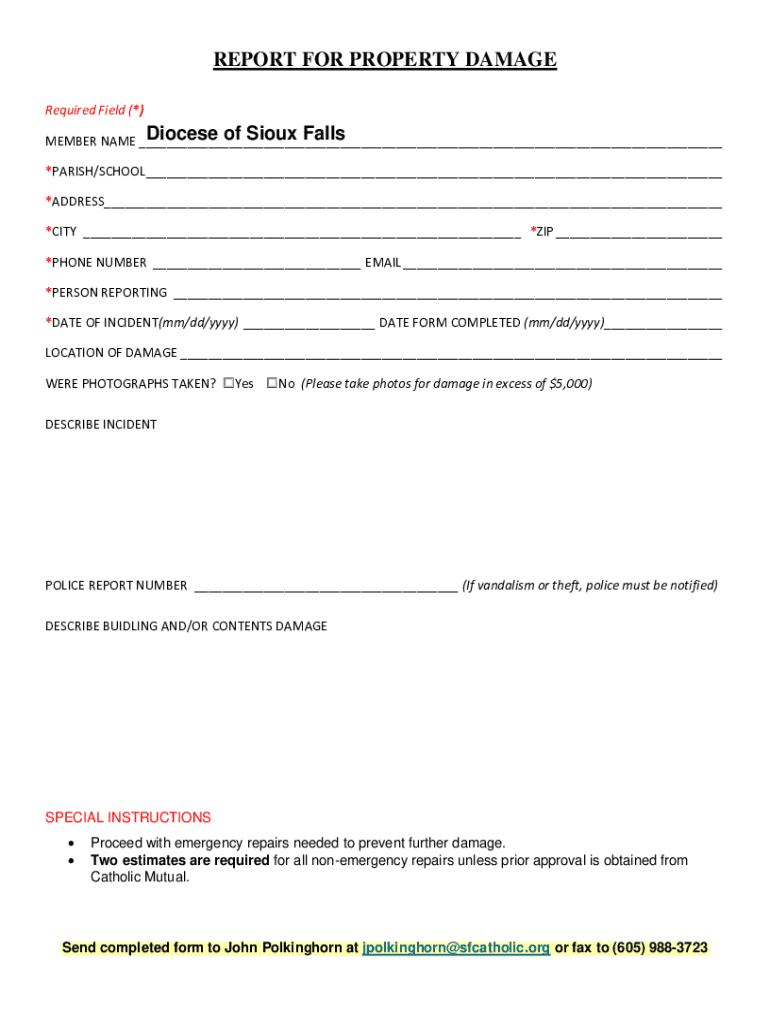 REPORT FOR PROPERTY DAMAGE Required Field (*)Diocese of Sioux Falls MEMBER NAME ___ *PARISH/SCHOOL ___ *ADDRESS___ *CITY ___ *ZIP ___ *PHONE NUMBER ___ EMAIL ___ *PERSON REPORTING ___ *DATE OF INCIDENT(mm/dd/YYY)