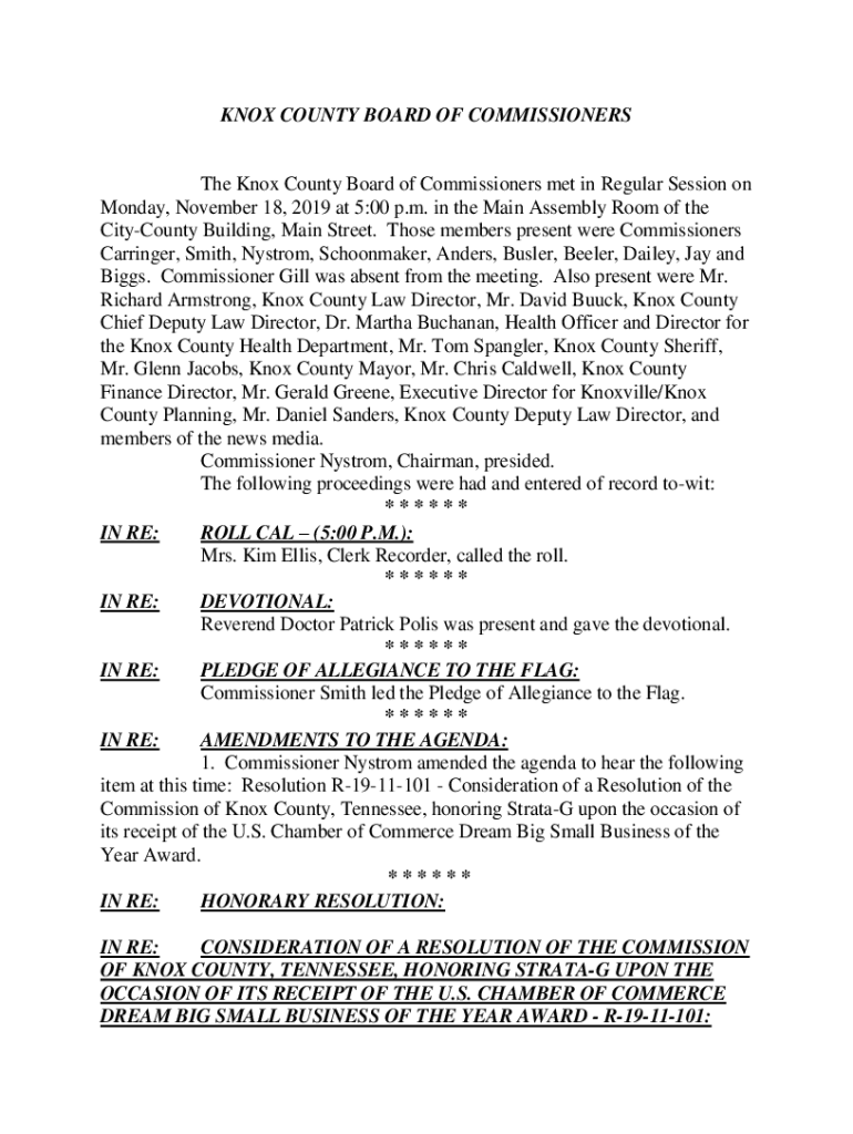 KNOX COUNTY BOARD OF Commissioners Knox County Board of Commissioners met in Regular Session on Monday, November 18, 2019, at 5:00 p.m. in the Main Assembly Room of the CityCounty Building, Main Street.