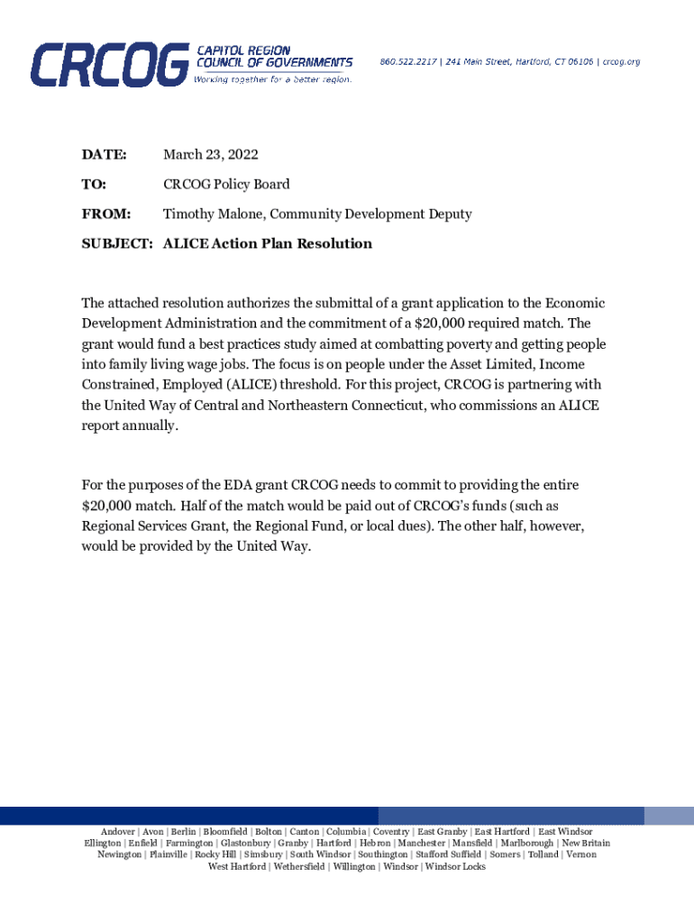 DATE:March 23, 2022TO:CR COG Policy Boardroom:Timothy Malone, Community Development DeputySUBJECT: ALICE Action Plan Resolution attached resolution authorizes the submittal of a grant application