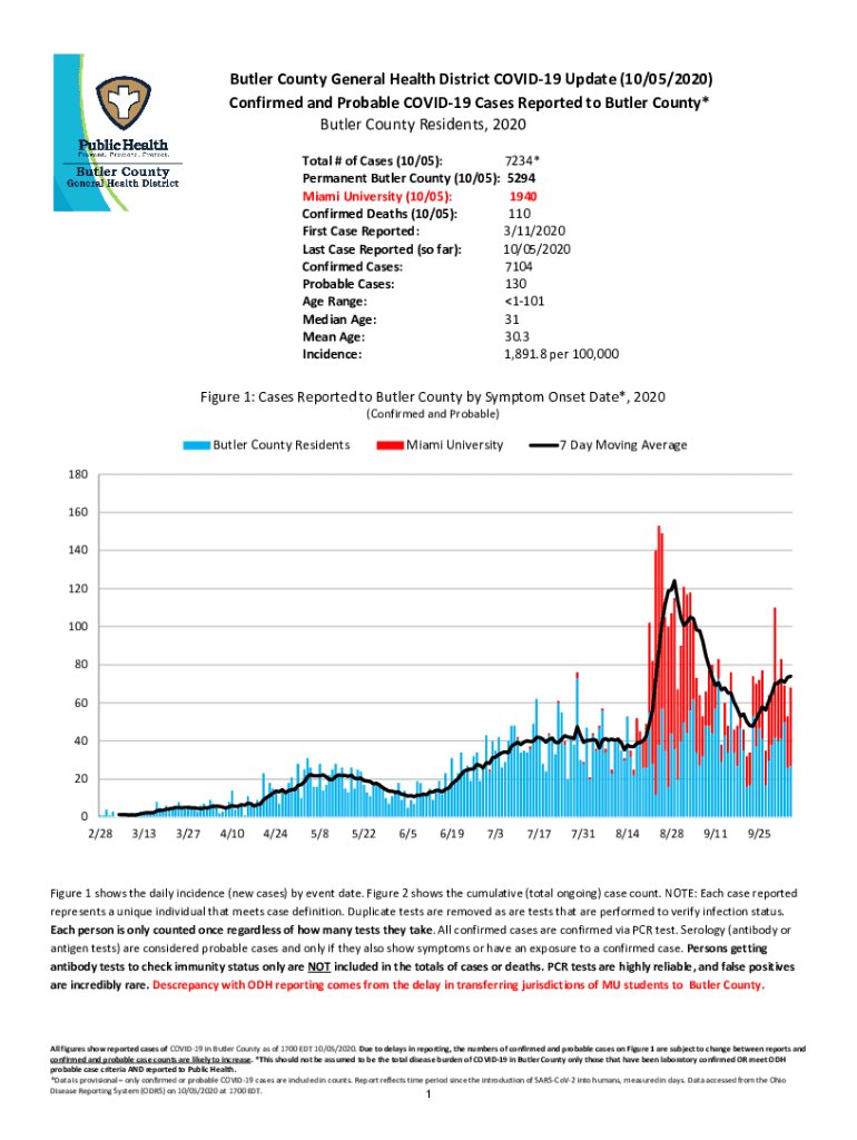 Butler County General Health District COVID-19 Update (10/05/2020) Confirmed and Probable COVID-19 Cases Reported to Butler County* Butler County Residents, 2020 Total # of Cases (10/05): 7234* Permanent