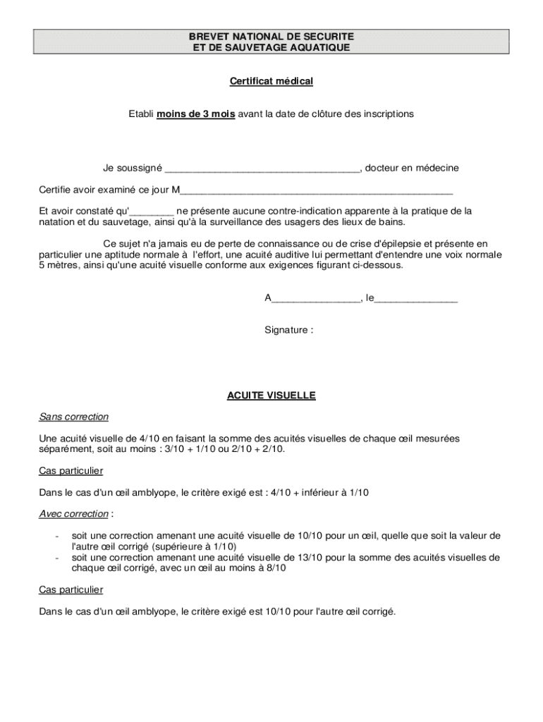 BREVET NATIONAL DE SECURITY ET DE AVERAGE AQUATIQUECertificat mdicalEtabli coins DE 3 moi savant la date DE culture DES inscriptions sous sign ___, doctor en decline Certified avoid examine CE four