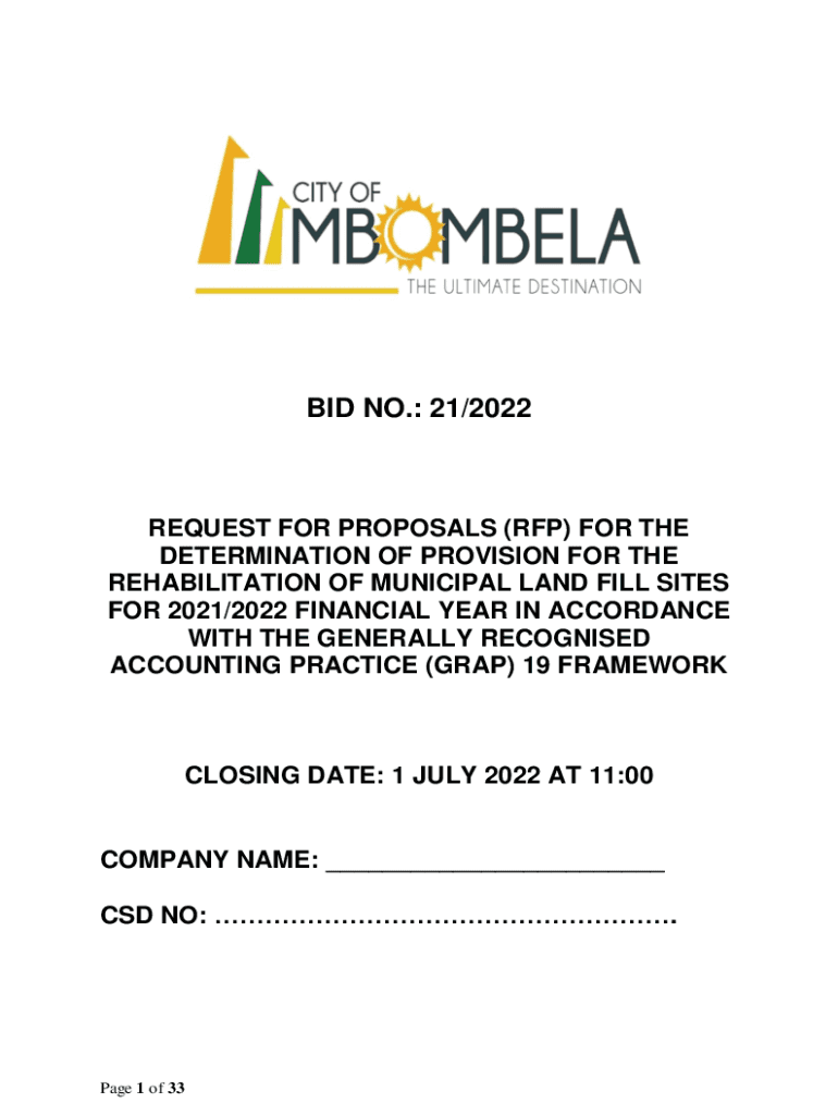 BID NO.: 21/2022REQUEST FOR PROPOSALS (RFP) FOR THE DETERMINATION OF PROVISION FOR THE REHABILITATION OF MUNICIPAL LAND FILL SITES FOR 2021/2022 FINANCIAL YEAR IN ACCORDANCE WITH THE GENERALLY Recognized