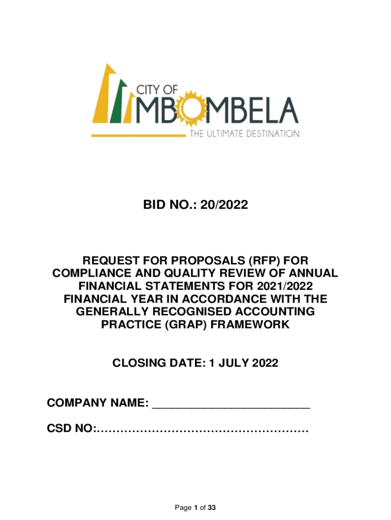 BID NO.: 20/2022REQUEST FOR PROPOSALS (RFP) FOR COMPLIANCE AND QUALITY REVIEW OF ANNUAL FINANCIAL STATEMENTS FOR 2021/2022 FINANCIAL YEAR IN ACCORDANCE WITH THE GENERALLY Recognized ACCOUNTING PRACTICE