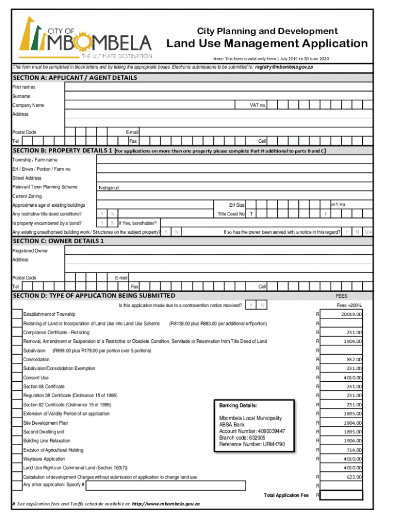 City Planning and Development Land Use Management Application Note: This form is valid only from 1 July 2019 to 30 June 2020This form must be completed in block letters and by ticking the appropriate