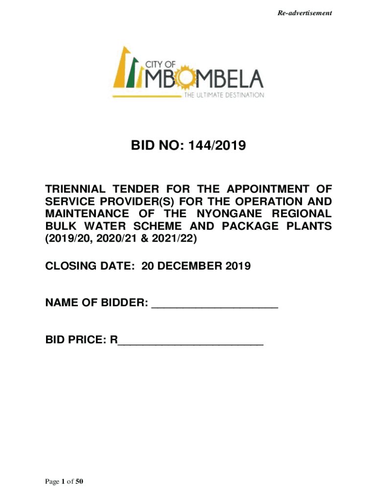 ReadvertisementBID NO: 144/2019 TRIENNIAL TENDER FOR THE APPOINTMENT OF SERVICE PROVIDER(S) FOR THE OPERATION AND MAINTENANCE OF THE ELONGATE REGIONAL BULK WATER SCHEME AND PACKAGE PLANTS (2019/20,