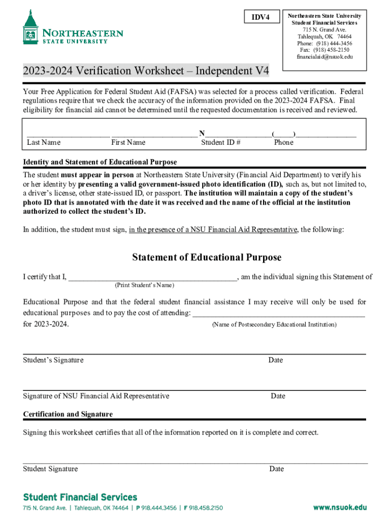 IDV4Northeastern State University Student Financial Services 715 N. Grand Ave. Tahlequah, OK 74464 Phone: (918) 4443456 Fax: (918) 4582150 financialaid@nsuok.edu20232024 Verification Worksheet Independent