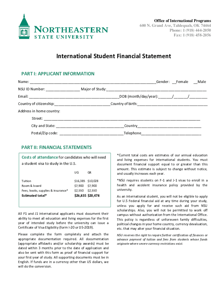 Office of International Programs 600 N. Grand Ave, Tahlequah, OK 74464 Phone: 1 (918) 4442050 Fax: 1 (918) 4582056International Student Financial Statement PART I: APPLICANT INFORMATION Name: ___Gender: