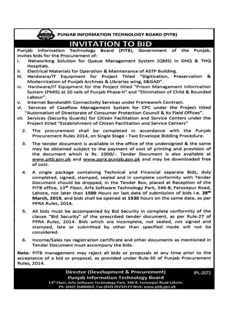 Tender Document Tender No. 2090320191PROCUREMENT OF NETWORKING SOLUTION FOR QUEUE MANAGEMENT SYSTEM (RMS) IN HQ & THE HOSPITALS Punjab Information Technology Board (PIT) 11th Floor, Area Software
