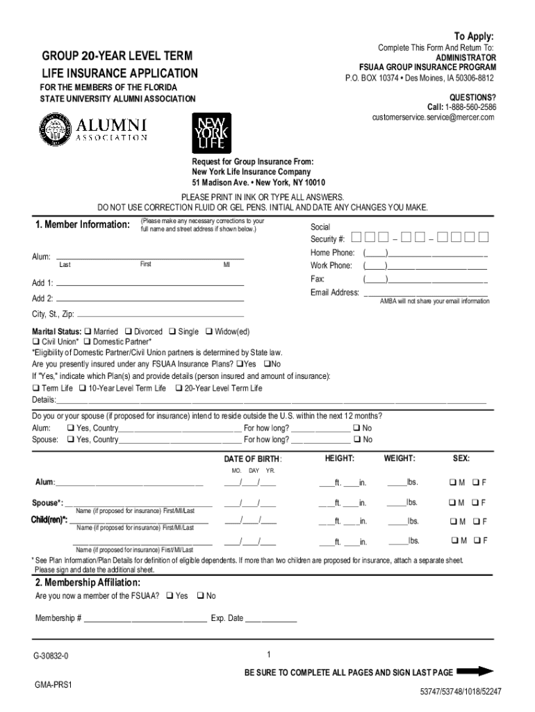 To Apply: Complete This Form And Return To: ADMINISTRATOR FS UAA GROUP INSURANCE PROGRAM P.O. BOX 10374 Des Moines, IA 503068812GROUP 20YEAR LEVEL TERM LIFE INSURANCE APPLICATION FOR THE MEMBERS OF