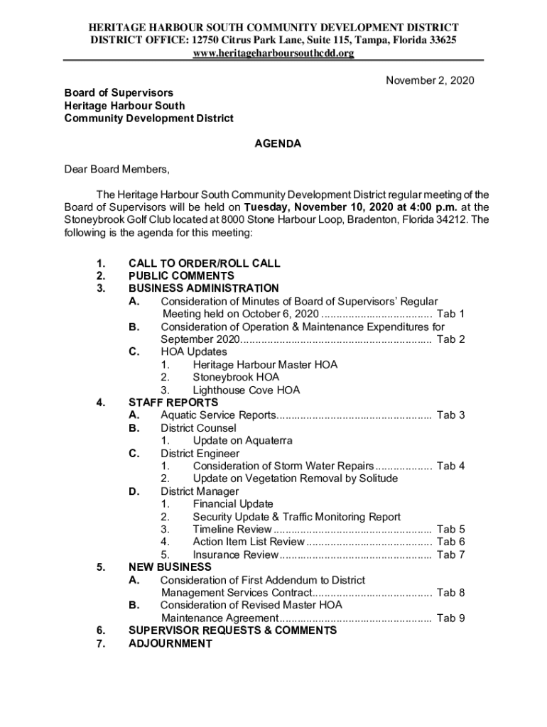 HERITAGE Harbor SOUTH COMMUNITY DEVELOPMENT DISTRICT OFFICE: 12750 Citrus Park Lane, Suite 115, Tampa, Florida 33625 www.heritageharboursouthcdd.org November 2, 2020Board of Supervisors Heritage Harbor