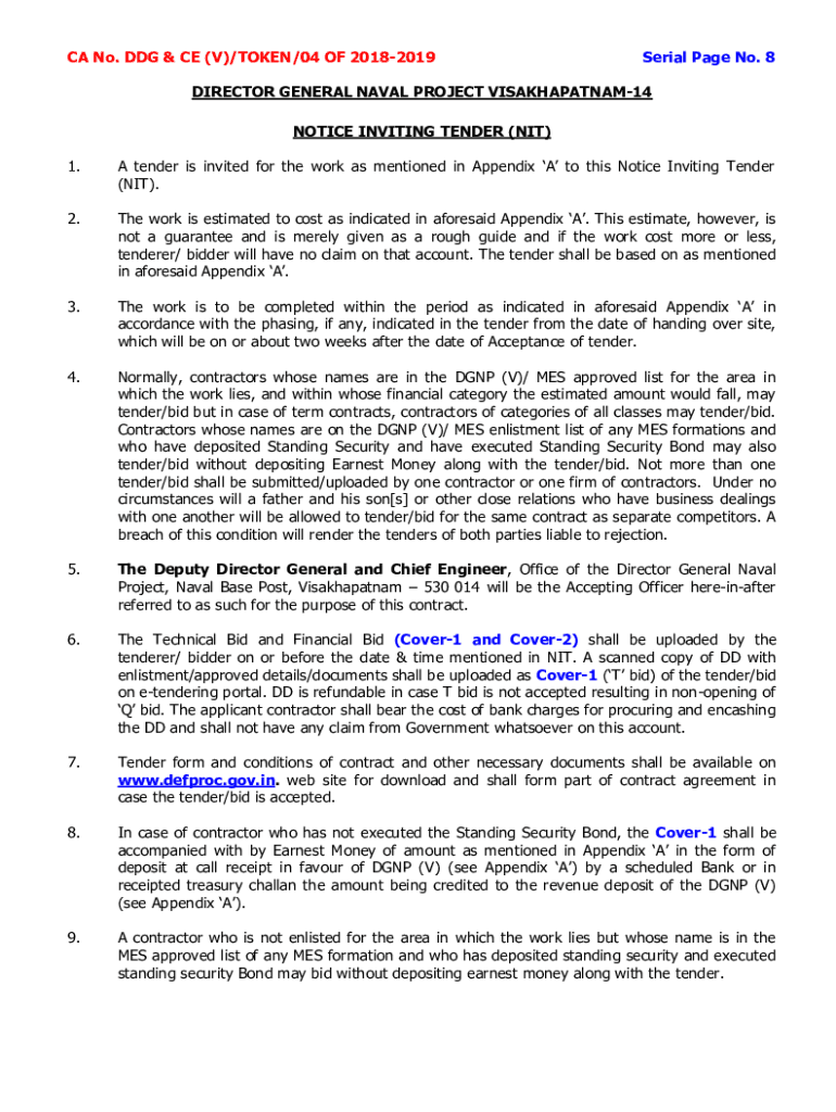 CA No. DOG & CE (V)/TOKEN/04 OF 20182019Serial Page No. 8DIRECTOR GENERAL NAVAL PROJECT VISAKHAPATNAM14 NOTICE INVITING TENDER (NIT) 1. A tender is invited for the work as mentioned in Appendix A