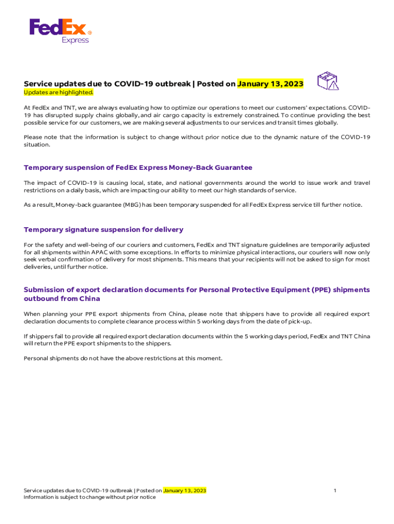 Service updates due to COVID-19 outbreak | Posted on January 13, 2023, Updates are highlighted. At FedEx and TNT, we are always evaluating how to optimize our operations to meet our customers expectations.