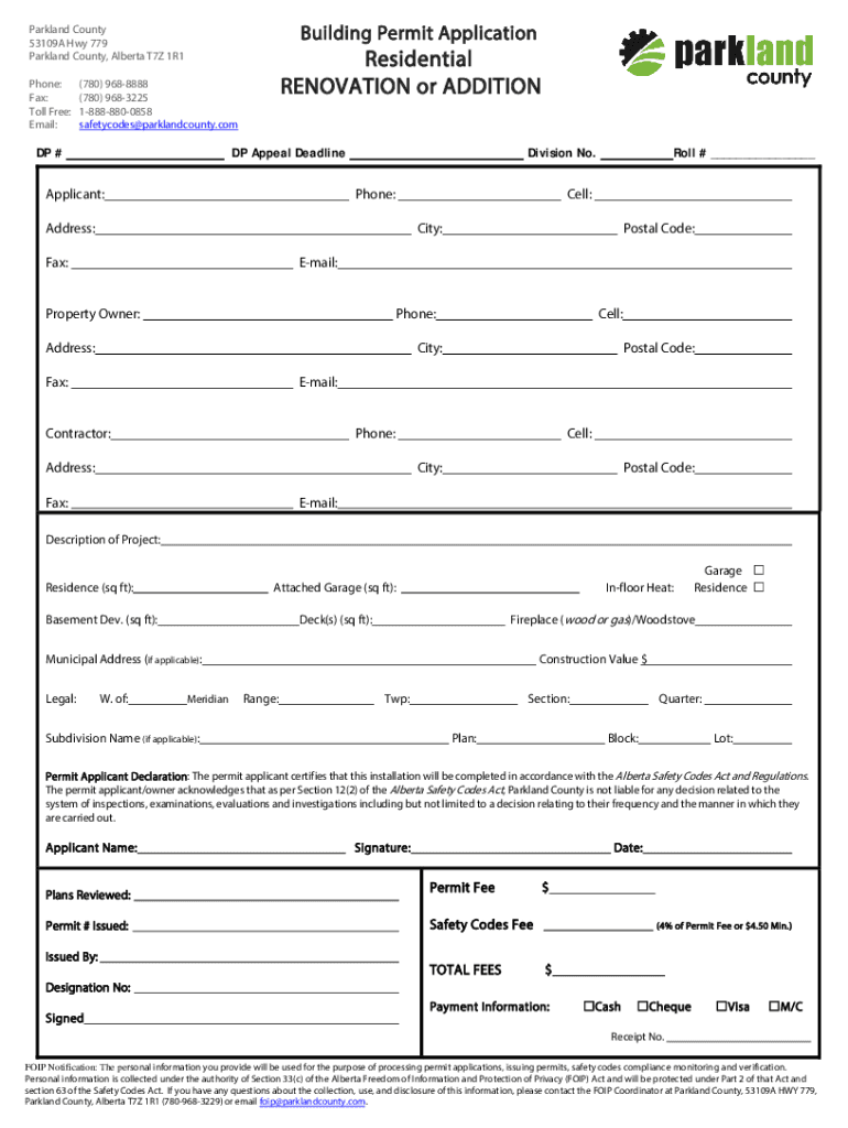 Building Permit ApplicationParkland County 53109A Hwy 779 Parkland County, Alberta T7Z 1R1 Phone: Fax: Toll Free: Email:Residential RENOVATION or ADDITION(780) 9688888 (780) 9683225 18888800858 safetycodes@parklandcounty.comDP