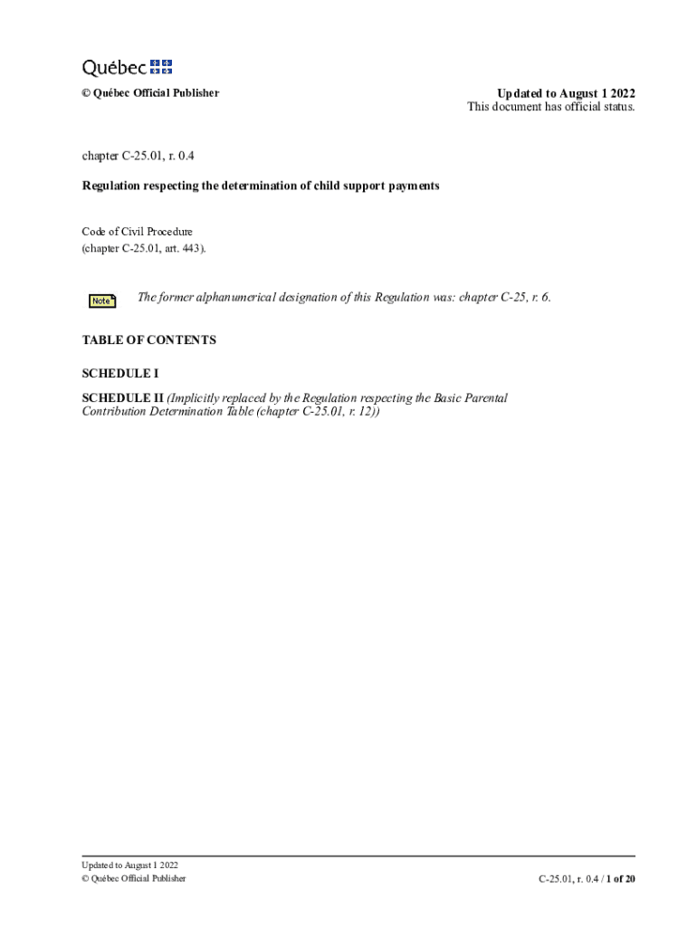 Quebec Official Publisher0 0 8 1 Updated to August 1, 2022, This document has official status. Chapter C25.01, r. 0.4 Regulation respecting the determination of child support payments C O Code of