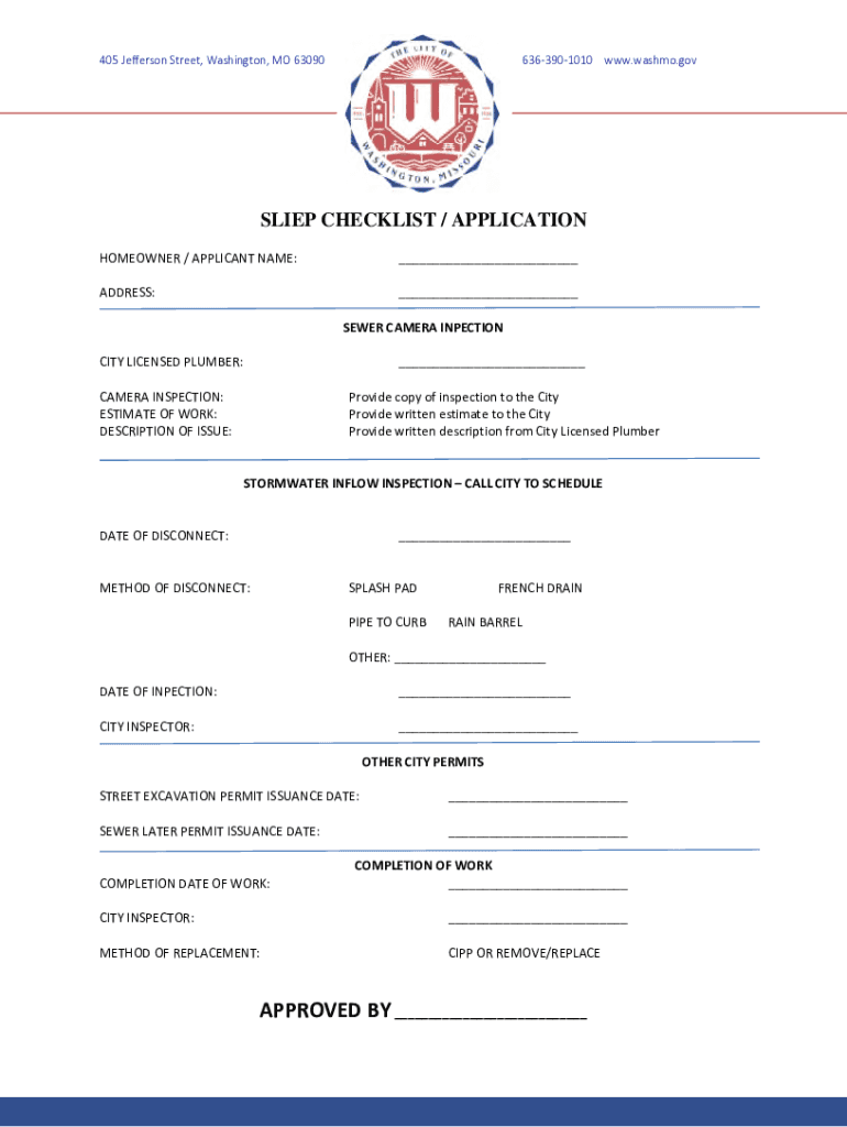 405 Jefferson Street, Washington, MO 630906363901010 www.washmo.govSLIEP CHECKLIST / APPLICATION HOMEOWNER / APPLICANT NAME:___ADDRESS:___ SEWER CAMERA INPECTIONCITY LICENSED PLUMBER:___CAMERA INSPECTION:
