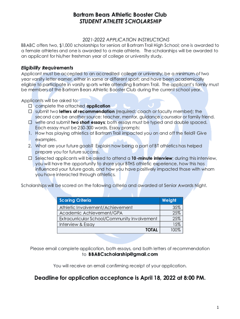 Bertram Bears Athletic Booster Club STUDENT ATHLETE SCHOLARSHIP 20212022 APPLICATION INSTRUCTIONSBBABC offers two, $1,000 scholarships for seniors at Bertram Trail High School; one is awarded to a