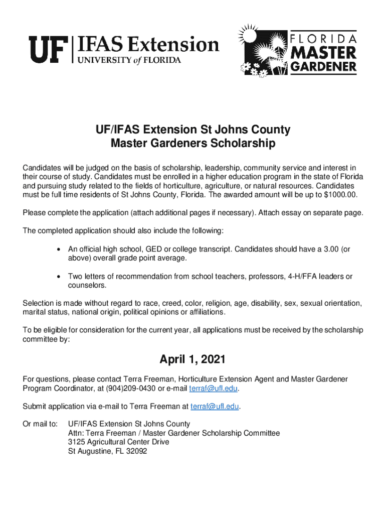 OF/IFAS Extension St Johns County Master Gardeners Scholarship Candidates will be judged on the basis of scholarship, leadership, community service and interest in their course of study. Candidates