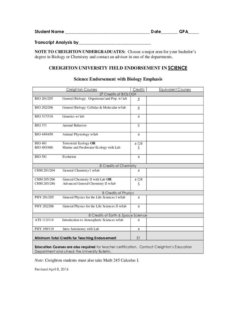Student Name ___ Date___ GPA___ Transcript Analysis by___ NOTE TO CREIGHTON UNDERGRADUATES: Choose a major area for your bachelors degree in Biology or Chemistry and contact an advisor in one of the