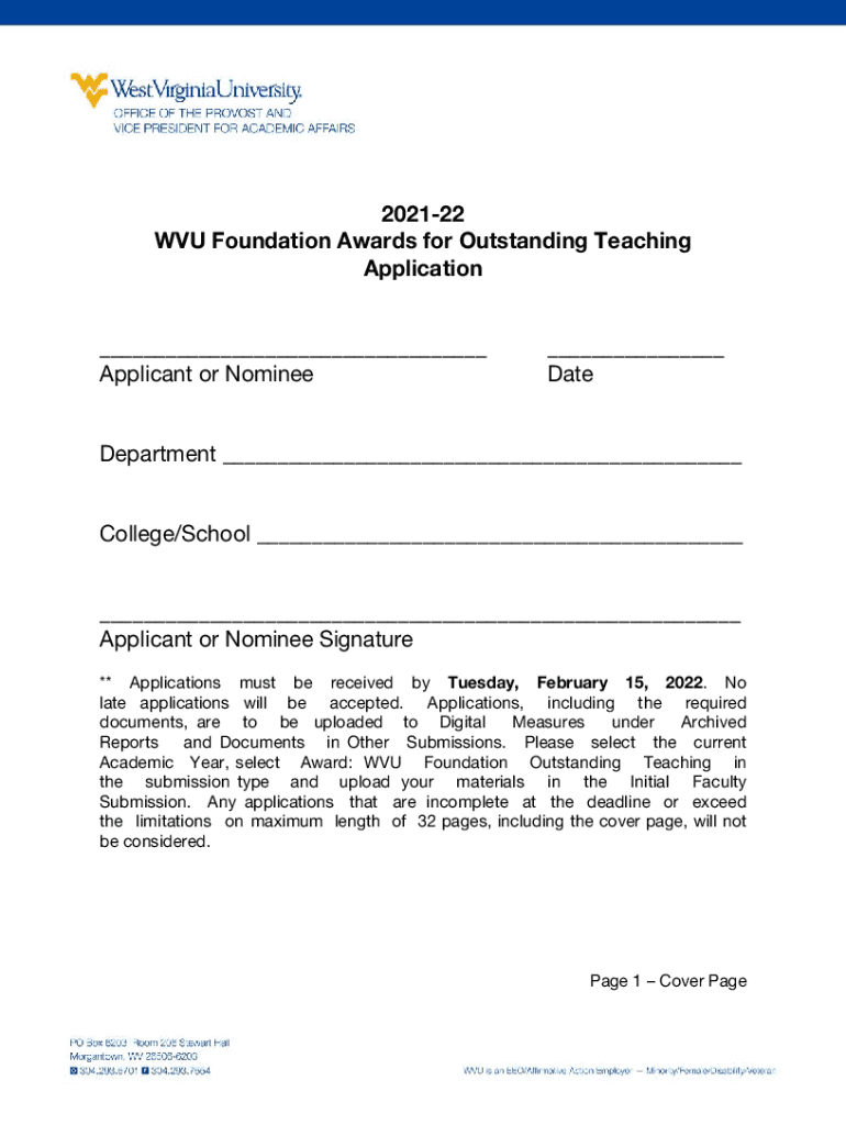 202122 WSU Foundation Awards for Outstanding Teaching Application ___ Applicant or Nominee___ DateDepartment ___ College/School ___ ___ Applicant or Nominee Signature ** Applications must be received