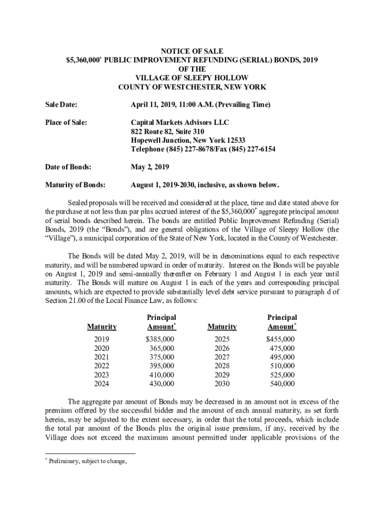 NOTICE OF SALE $5,360,000 PUBLIC IMPROVEMENT REFUNDING (SERIAL) BONDS, 2019 OF THE VILLAGE OF SLEEPY HOLLOW COUNTY OF WESTCHESTER, NEW YORK *Sale Date:April 11, 2019, 11:00 A.M. (Prevailing Time)Place