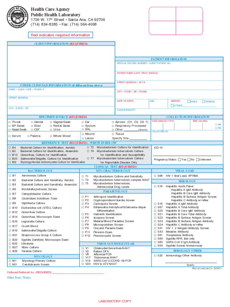 Health Care Agency Public Health Laboratory1729 W. 17th Street Santa Ana, CA 92706 (714) 8348385 Fax: (714) 5644068 Red indicates required information CLIENT INFORMATION (REQUIRED)PATIENT INFORMATION
