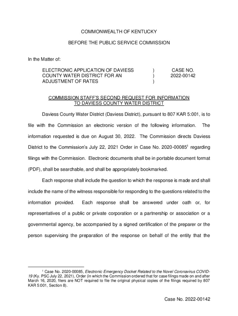 COMMONWEALTH OF KENTUCKY BEFORE THE PUBLIC SERVICE Commissioning the Matter of: ELECTRONIC APPLICATION OF DAVIES COUNTY WATER DISTRICT FOR AN ADJUSTMENT OF RATES)))CASE NO. 202200142COMMISSION STAFFS