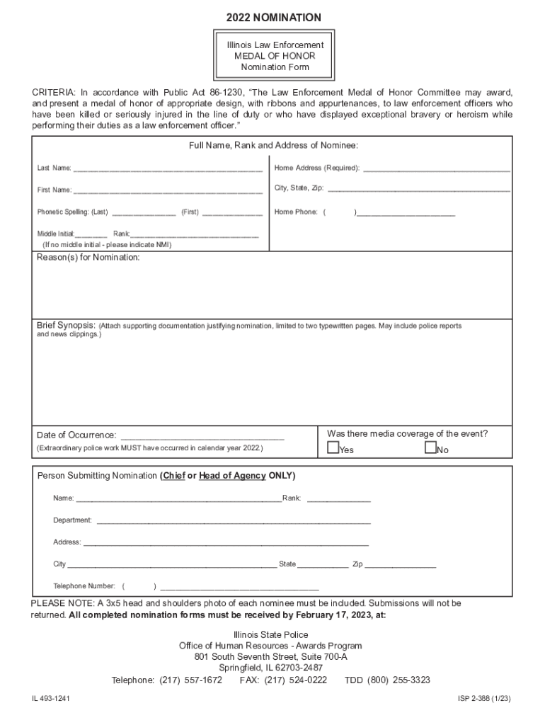 2022 NOMINATION Illinois Law Enforcement MEDAL OF HONOR Nomination Form CRITERIA: In accordance with Public Act 861230, The Law Enforcement Medal of Honor Committee may award, and present a medal