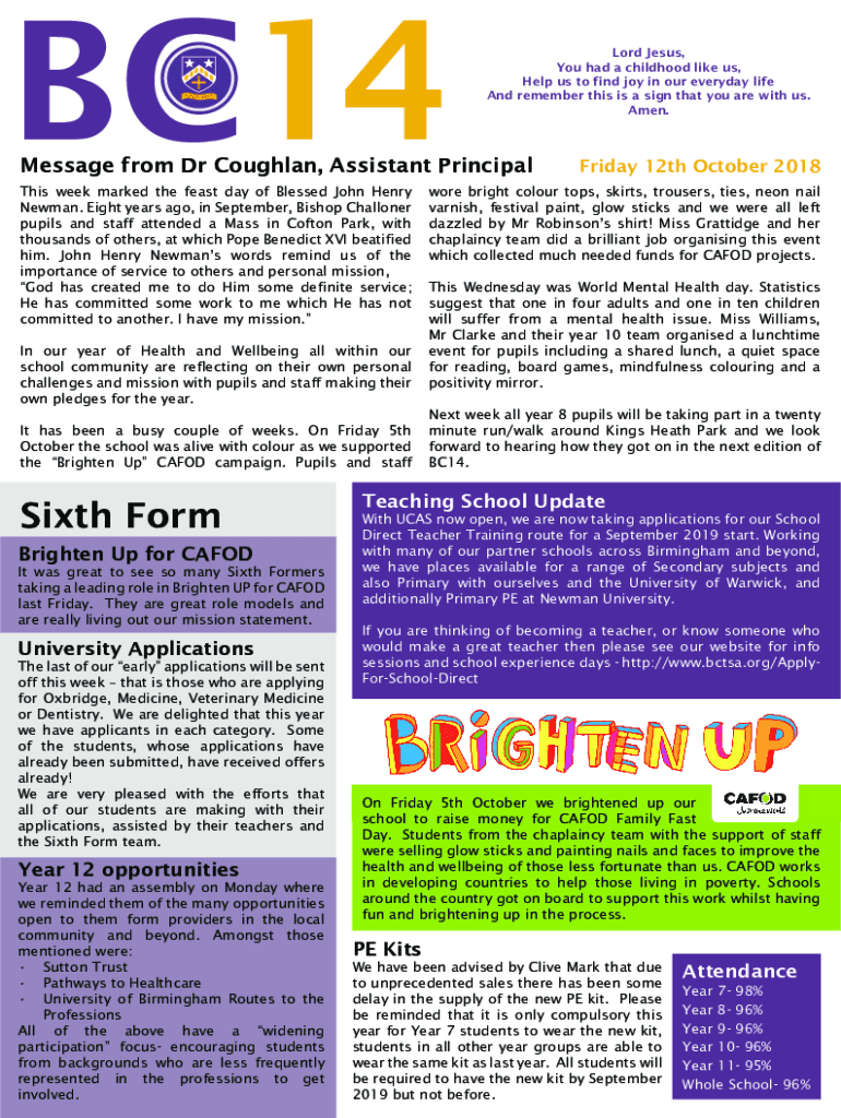 BC14Lord Jesus, You had a childhood like us, Help us find joy in our everyday life And remember this is a sign that you are with us. Amen. Message from Dr Coughlin, Assistant Principal This week marked