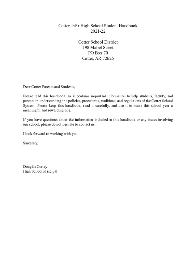 Cotter Jr/Sr High School Student Handbook 202122 Cotter School District 198 Mabel Street PO Box 70 Cotter, AR 72626Dear Cotter Parents and Students, Please read this handbook, as it contains important