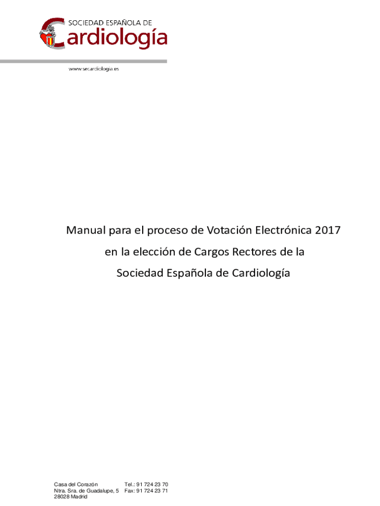 Manual para El process DE Vitamin Electronica 2017 en la election DE Cargos Restores DE la Societal España de CardiologaCasa del Corazón Tel.: 91 724 23 70 NRA. SRA. De Guadalupe, 5 Fax: 91 724