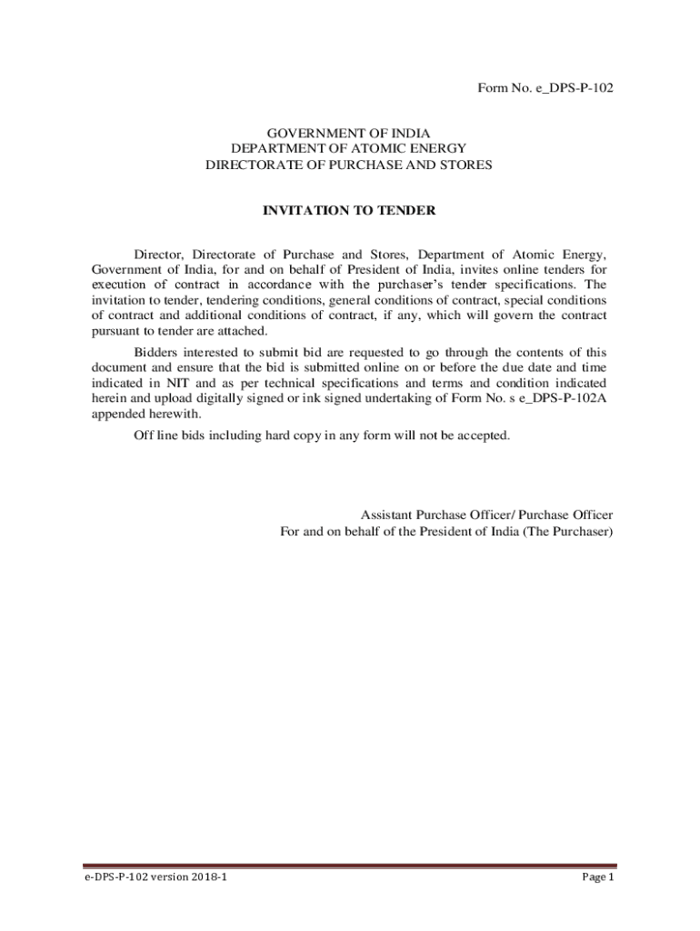 Form No. e_DPSP102GOVERNMENT OF INDIA DEPARTMENT OF ATOMIC ENERGY DIRECTORATE OF PURCHASE AND STORESINVITATION TO TENDER Director, Directorate of Purchase and Stores, Department of Atomic Energy,
