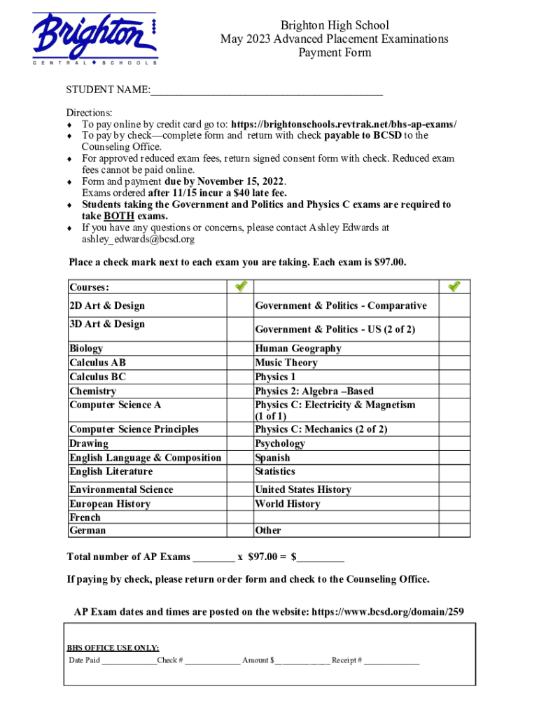 Brighton High School May 2023 Advanced Placement Examinations Payment Form STUDENT NAME:___ Directions: To pay online by credit card go to: https://brightonschools.revtrak.net/bhsapexams/ To pay by