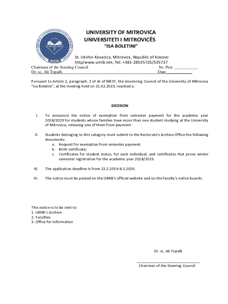 Get the free The Rector of the University of Mitrovica "Isa Boletini"