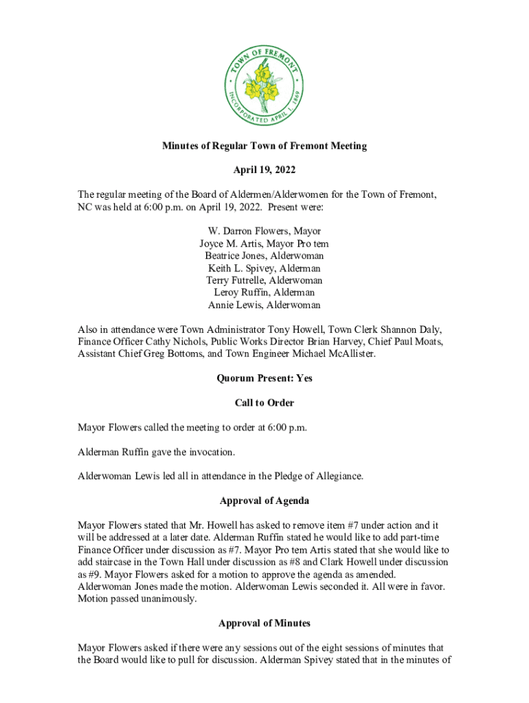 Minutes of Regular Town of Fremont Meeting April 19, 2022, The regular meeting of the Board of Aldermen/Alderwomen for the Town of Fremont, NC was held at 6:00 p.m. on April 19, 2022. Present were: