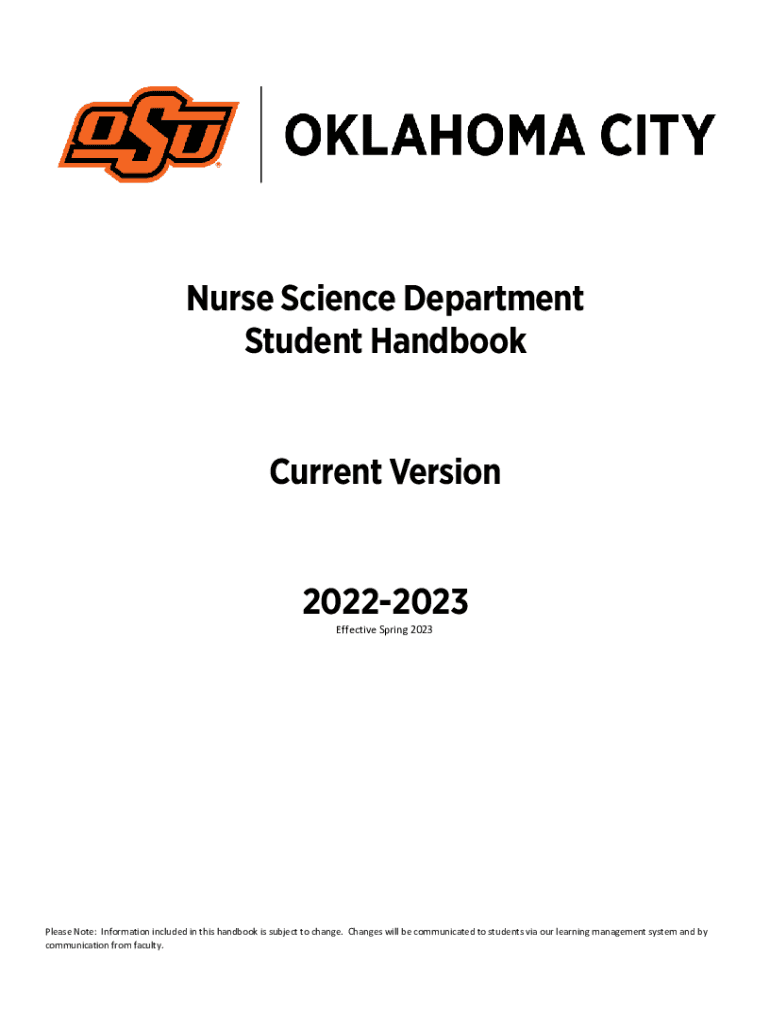 Nurse Science Department Student Handbook Current Version 20222023 Effective Spring 2023Please Note: Information included in this handbook is subject to change. Changes will be communicated to students