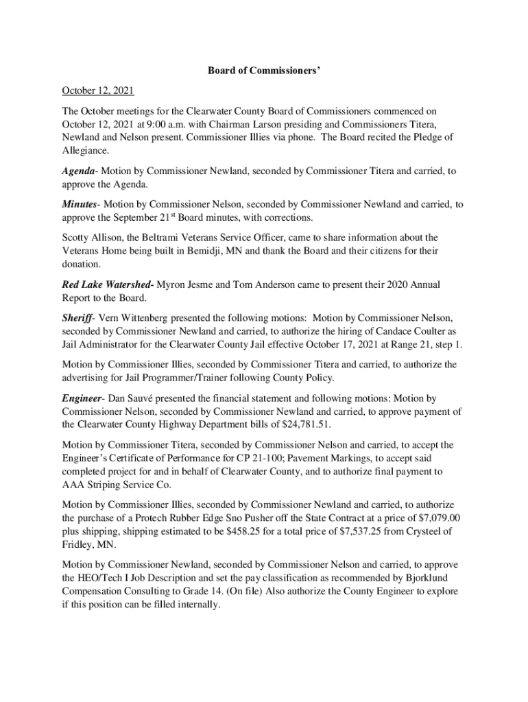 Board of Commissioners October 12, 2021, The October meetings for the Clearwater County Board of Commissioners commenced on October 12, 2021, at 9:00 a.m. with Chairman Larson presiding and Commissioners