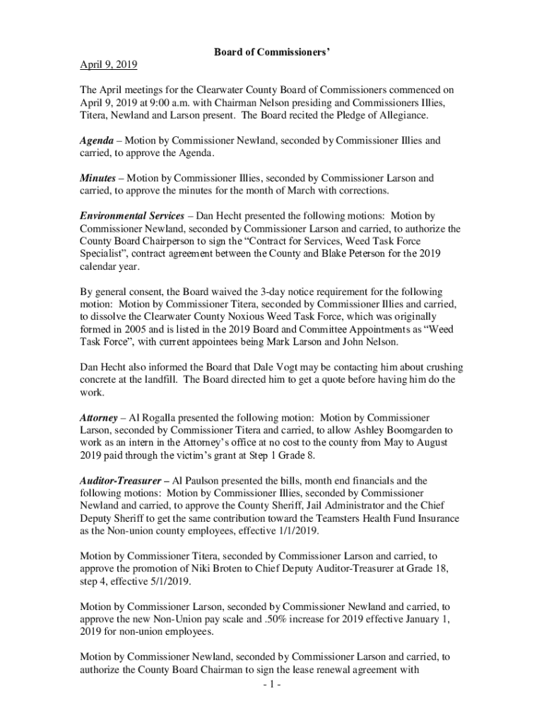 Board of Commissioners April 9, 2019, The April meetings for the Clearwater County Board of Commissioners commenced on April 9, 2019, at 9:00 a.m. with Chairman Nelson presiding and Commissioners