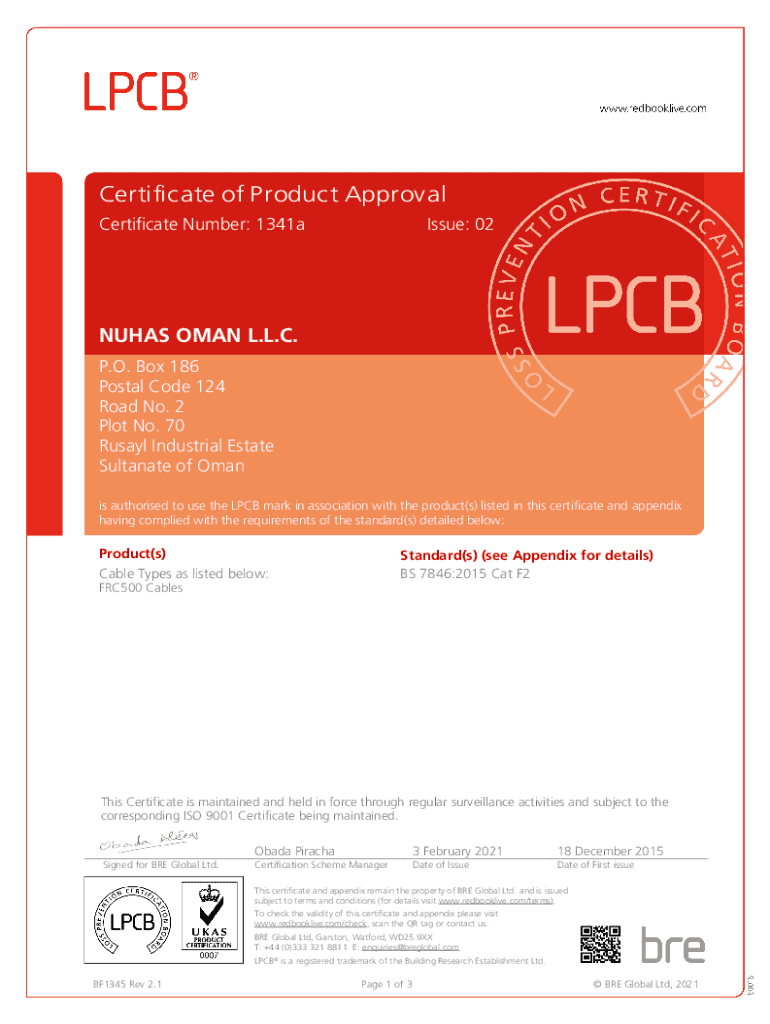 Certificate of Product Approval Certificate Number: 1341aIssue: 02NUHAS OMAN L.L.C. P.O. Box 186 Postal Code 124 Road No. 2 Plot No. 70 Rural Industrial Estate Sultanate of Oman is authorized to use