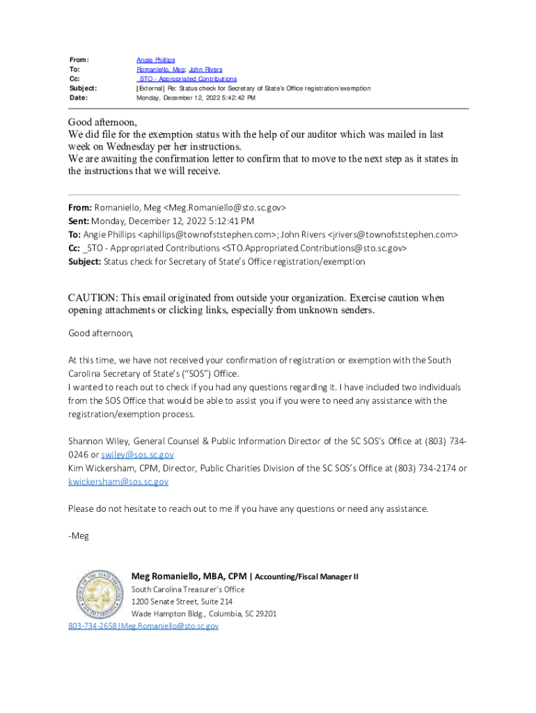 From: To: Cc: Subject: Date:Angie Phillips Romanies, Meg; John Rivers _STO Appropriated Contributions [External] Re: Status check for Secretary of States Office registration/exemption Monday, December
